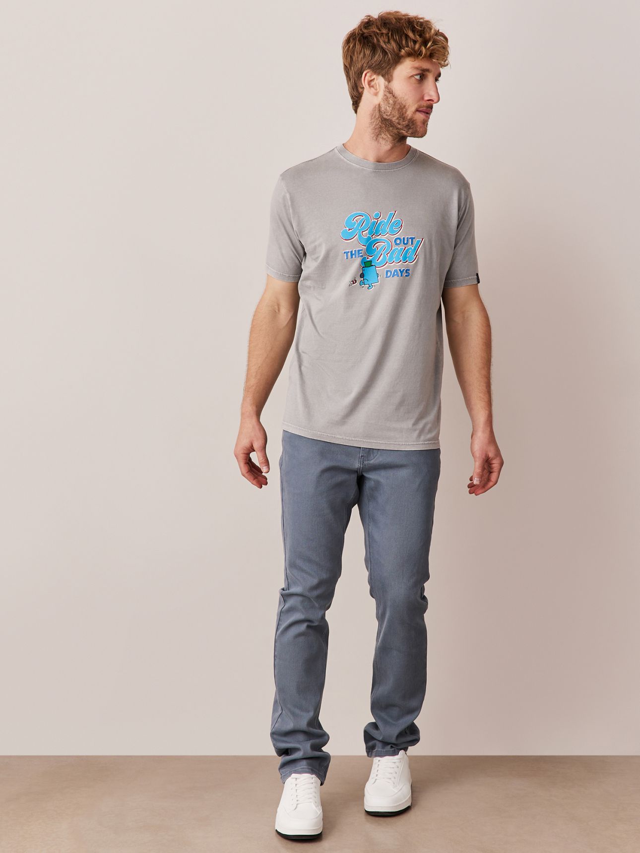 מכנסיים 5 כיסים בגיזרה צרה, עשויים בד דריל אלסטי, בסגירת כפתור ורוכסן.