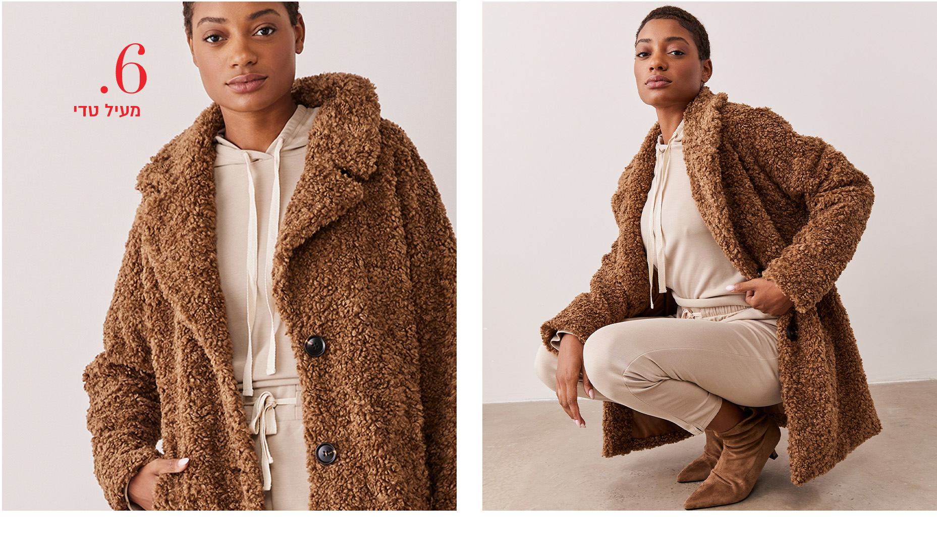 מעיל ה-TEDDY הוא בעצם מעיל צמרירי העשוי פרווה סינטטית. המעיל הינו לרוב רחב, מחמם ומפנק כל כך, שכשתחזרו הביתה מהעבודה ותנחתו על הספה, לא תרצו להוריד אותו כי הוא מרגיש קצת כמו כירבולית מפנקת.