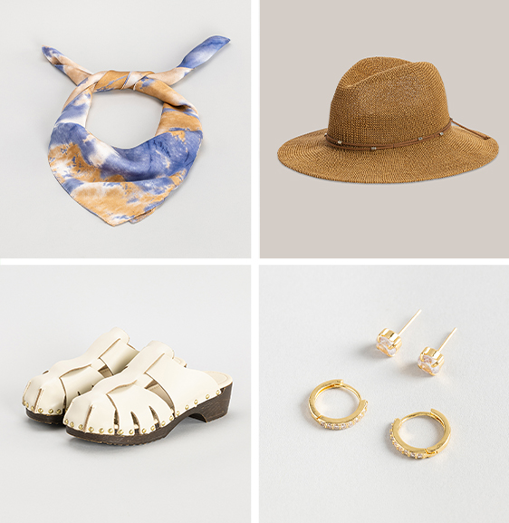 שמלות מקסי עם כתפיות דקות, צעיפים מודפסים שתקשרי על הצוואר או על הראש, כפכפים קלועים וכובע קש רחב.
